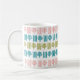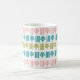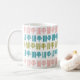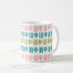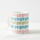 This mug has a mid-century modern Christmas design of four lines and a Christmas tree in pink, green, and turquoise repeating across the design. Like the design but want different colours? Message me.