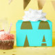A modern pattern of white geometric trees, some with snow white ornaments...all on an aqua blue background.