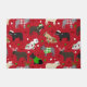 Cute French Bulldogs dressed in festive holiday outfits, Santa hats and argyle sweaters with scattered Christmas ornaments on a red background.