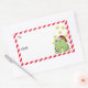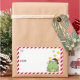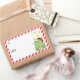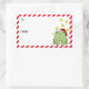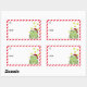 Fun Christmas labels for your presents. A happy green frog wearing a red and white Santa hat and surrounded by bright yellow stars is sitting on the right hand side. On the left are spaces to add the to and from info and a red and white diagonal stripe border.
