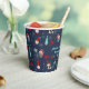 Add your name and celebration date to these paper napkins with whimsical holiday design featuring Santa cupcakes, snowmen, gift boxes, string lights, and snowflakes on a dark blue background.