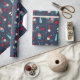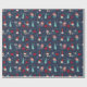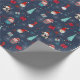 Add your family name and celebration date to wrapping paper with whimsical holiday design featuring Santa cupcakes, snowmen, gift boxes, string lights, and snowflakes on a dark blue background.
