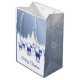 Gift bag shown with a snow scene, Christmas star and blue deer/elk gazing at the tree and star off in the background. Deer/Elk picture on both front and back. Sides are blue with white snowflake pattern.