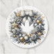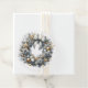 This gift tag is shown with a festive holiday wreath print in colors of silver and gold.