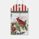 Christmas gift tags with a cardinal and pine boughs, red and white stripes and green band.