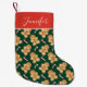 Decorate your home for the holidays with a Christmas stocking that looks good enough to eat! The stocking features your name at the top in a white calligraphy script with a red background. The personalized Christmas stocking features a pattern of painted gingerbread men with red and white candy canes against a dark green background.