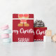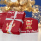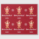 Modern Christmas gift wrap for kids, with a minimalist design that includes a gingerbread figure of Santa, snowflakes, the greeting "Merry Christmas" in stylish typography, and a personalized name. On a Xmas red background.
