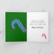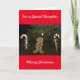 Cute Gingerbread Man Christmas Greeting Card. Personalize outside of card to read Goddaughter, Son, Aunt, Grandparent, etc. Front of Card has a festive Christmas scene with a happy Gingerbread Man holding a wrapped present, Candy Canes and colourful outside holiday trees lights. Inside has special message and pink and blue, and red and white candy canes. Personalize inside of card with YOUR family name. Leave message inside of card, or delete and insert your own, if you wish. Back of Card has smaller artwork of old-fashioned green Christmas tree with yellow star, candy canes, and JOY written on a red tree skirt with holly leaves and red berries and the wording, Peace on Earth. Lovely Christmas Holiday card to send to family and friends. Original Photography, Artwork and Verse Saying by TamiraZDesigns.