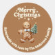 Perfect for homemade cookies, bakery goods. A brown background and beige text. Merry Christmas is written with a retro style font. Decorated with a gingerbread man holding a Christmas tree. Personalize and add your family