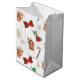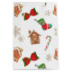 Festive Christmas gift bag that features snowflakes, candy canes, gingerbread houses, bows, and Christmas stockings.