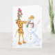 A cute hand illustrated card of a giraffe building a snowman. The Giraffe and the snowman wearing matching scarfs.