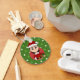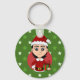 Design with an illustration of a cute smiling happy girl with short black hair, she is wearing red and white Santa Claus costume and holding a present; Christmas holidays design with a seamless green background with stars