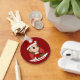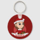 Keychain with an illustration of a cute smiling happy girl with long brown hair, she is wearing red and white Santa Claus costume and holding a present; with editable text template for your name or message, Christmas holidays design with a red background