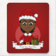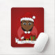 Design with an illustration of a cute smiling happy black girl with short hair, she is wearing red and white Santa Claus costume and holding a present; with editable text template for your name or message, Christmas holidays design with a red background