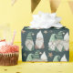 Christmas Gnomes in green and gold on Christmas wrapping paper.