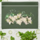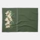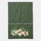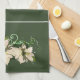 This holiday designed kitchen towel features a hunter green background with whimsical green glitter swirls and a trio of white poinsettias. Use this festive towel at Christmas and throughout the winter season. This towel will look lovely when coordinated with a white themed Christmas colour scheme.