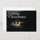 The card shows an atmospheric, wintry scene with a small, illuminated wooden hut in the middle of a snow-covered forest. The warm light source inside creates a beautiful contrast to the dark, peaceful surroundings. The elegant "Merry Christmas" lettering in white gives the motif a festive touch. 🎄✨
