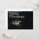 The card shows an atmospheric, wintry scene with a small, illuminated wooden hut in the middle of a snow-covered forest. The warm light source inside creates a beautiful contrast to the dark, peaceful surroundings. The elegant "Merry Christmas" lettering in white gives the motif a festive touch. 🎄✨