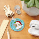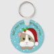Cute brown and white guinea pig ready for Christmas wearing a red and white Santa hat. Above him is a template in green lettering to add your own festive message to personalize this adorable key chain. The background is blue dotted with white falling snowflakes.