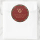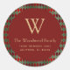 This elegant return address sticker features a burgundy red circle on a geometric harlequin pattern background in burgundy, green and gold. Personalize the design with your monogram initial and family name in gold serif font, with your address below in sans serif.