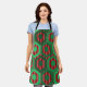 This apron has a geometric design of hexagons in four shades of green on a field of stripes in two shades of red.