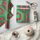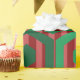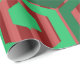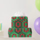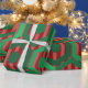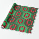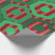 This wrapping paper has a geometric design of hexagons in four shades of green on a field of stripes in two shades of red.