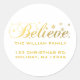 Christmas Holiday Gold Believe Address Sticker. Believe in Christmas and the peace, joy and cheer it brings to the young and adult,alike.the word "Believe" in gold script text overlay design with golden snowflakes falling on a snow white background.High quality, full-colour, full-bleed printing sticker. Scratch-resistant front, easy peel-and-stick back Address Sticker designed by nadil2 and printed by Zazzle Paper.