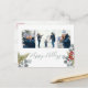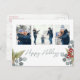 This design features Christmas holiday red holly berries, with photo 4 three family picture layout, botanical greenery winter foliage, a watercolor red green blue silver, elegant pine branch twig branches, classic traditional eucalyptus leaves, and-lettered script calligraphy, with modern calligraphy script font, modern elegant simple trendy, a lovely multi photo collage Christmas holiday photo greeting card