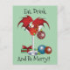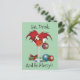 A cute red dragon in a martini glass holding a green olive. Ornaments, a Christmas present and green olives all around.