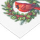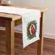 Holiday table runner is shown with a festive cardinal bird wreath print.