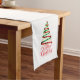 Holiday table runner is shown with a festive ribbon tree print.
