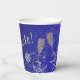 Pretty paper cups - giant red poinsettia and golden champagne flutes make up the design on a gradient blue background. The word "celebrate" across in white font.