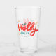 Christmas Holly Jolly Fun Winter Personalized Name Drinking Glass features the text "Holly Jolly in red and blue modern calligraphy script typography and personalized with your custom name. Accented with holly and snowflakes. Perfect gifts for Christmas and the holidays or for Christmas parties. Designed by ©Evco Holidays www.zazzle.com/store/evcoholidays