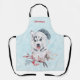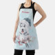 An apron with a whimsical and cute watercolor painting of a husky dog wearing a blue Santa hat.