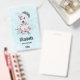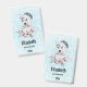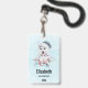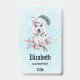 Personalized name badge with a whimsical and cute watercolor painting of a husky dog wearing a blue Santa hat.
