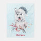 A blanket with a whimsical and cute watercolor painting of a husky dog wearing a blue Santa hat.