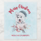 Bottle labels with a whimsical and cute watercolor painting of a husky dog wearing a blue Santa hat.
