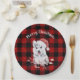 Husky dog with Christmas Santa Claus hat in snowflakes on red and black buffalo plaid.