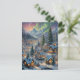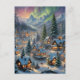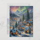 This Christmas card shows a snow-covered village with brightly lit houses in the mountains, surrounded by tall fir trees, polar lights shining in the sky. Send Christmas greetings to your friends and family. Custom text and back.