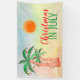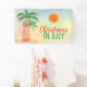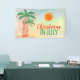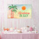 Invite family and friends to your Christmas-themed celebration and decorate it with this island-style banner featuring hand-drawn palm trees decorated with lights on a watercolor background.
