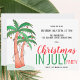 Invite family and friends to your Christmas in July party with this fun invitation featuring watercolor palm trees decorated with lights and baubles.