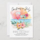 Tropical theme Christmas in July invitation features a watercolor beach sunset, cocktails, hibiscus flowers and palm leaves with a "Christmas in July" caption in handwritten style lettering. Perfect for summer family get togethers, reunions, early or delayed holiday parties, etc.