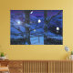 A winter night, looking over a gate flanked by two trees down into a snow-covered glen between rocky hills, filled with little farms and hedgerows and stone walls. A warm glow shines from many windows, Christmas lights sparkle on trees and fences, and a Christmas star beams from the roof of a manor house, all under the rays of a full moon.