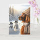 An Irish Setter dog is dressed in a woolly hat and scarf standing in a snowy landscape with two smiling snowmen in the background