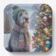 An Irish Wolfhound wearing a knitted hat and colourful scarf stands beside a decorated Christmas tree on a snowy day