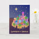 A joyful Christmas card with the greeting, Llawenydd y Nadolig ('Christmas Joy' in Welsh), with a starry sky, the three wise men on their camels in the distance, and Joseph, Mary and a donkey making their way into the brightly coloured little town of Bethlehem. The lettering, Christmas Joy, and stars are in gold-effect paint (not gold foil). A mixed-media design by Judy Adamson.