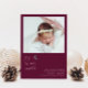 Elegant and modern Christmas theme birth announcement card featuring a hand lettered script text that says "joy to our world" with a little illustration of a mistletoe. This is a birth announcement card for the holiday seasons! Add your photos, birth stats, and a message! The background is cranberry.