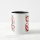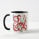 Festive holiday mug with cute green holly leaves and red berries. The centre says "Joy" in red and black script surrounded by cute flourishes.