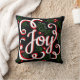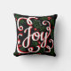 Festive throw pillow with the word "Joy" in white and red script with flourishes, red holly berries, and green leaf designs over black. The backside has your family's initial letter and full name.