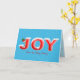 Bold red joy text on aqua blue background with snowflakes and snowman for Christmas